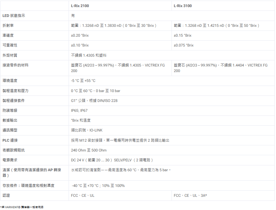 為您帶來長久以來期盼的產品:一款可連續監測金屬加工機台(例如冷卻潤滑劑、水性高分子淬火液)、工業製程及果蔬加工中的白利糖度濃度的線上折射儀,L-Rix 2100 與 L-Rix 3100 結合了同級產品中最佳的品質、價格、精準度與體積設計。L-Rix 2100/3100 系列可延長工具與機器壽命、提升製品品質、減少停機時間、降低維護成本,確保多年穩定運作,助您應對嚴苛的工業環境挑戰。